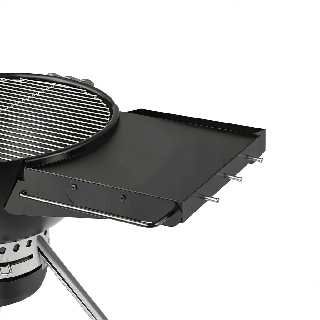 It fits 18-inch charcoal grills such as Weber Original Kettle, Original Kettle Premium, and Master-Touch models, providing a stable attachment for added storage.