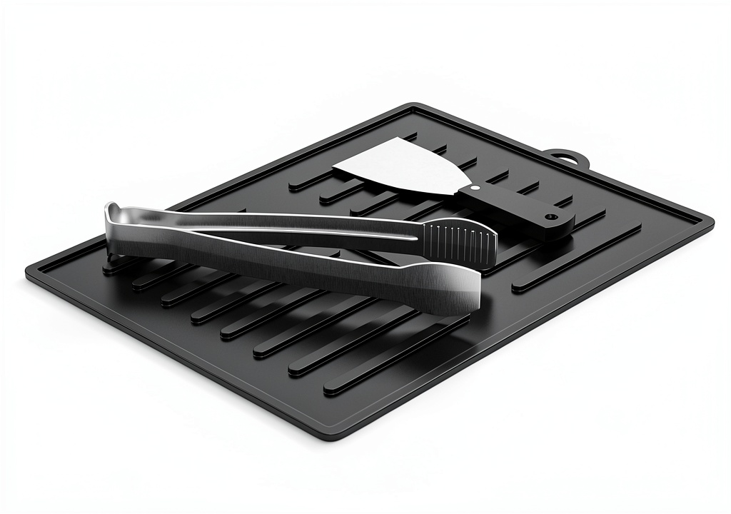 Wipe the silicone mat with a damp cloth or mild soap, and clean the alloy steel shelf with a soft brush or cloth to remove debris; avoid abrasive cleaners to preserve the finish.