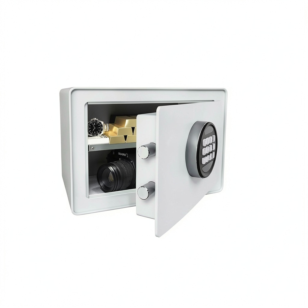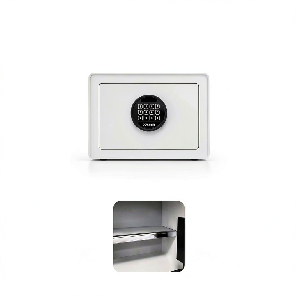 The E68 White Hotel Safe offers reliable security with its alloy steel construction and modern design. It can be mounted on the floor or wall, making it versatile for various settings like hotels, offices, or homes. This safe requires batteries for operation and provides peace of mind for storing important items.