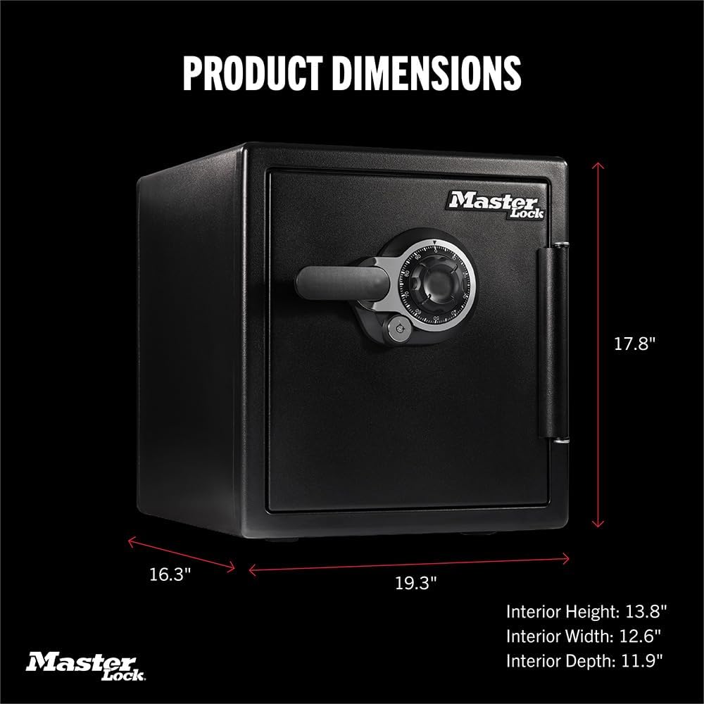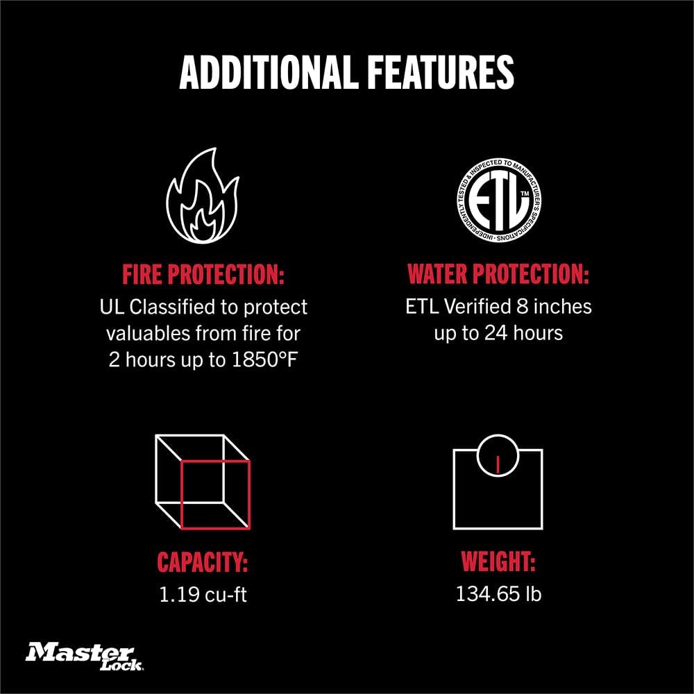 The Master Lock Premium Fireproof Safe is engineered for superior protection of your important documents and valuables. Constructed from durable stainless steel, this safe features UL Classification for withstanding 2 hours at 1850°F, ensuring interior temperatures remain safe for paper, digital media, and other sensitive items. It is ETL Verified for 24-hour waterproof protection in up to 5 inches of water, making it resilient in flood or fire-fighting scenarios. Available in sizes of 0.82, 1.23, and 2.0 cubic feet, with options for electronic combination or keypad locks, it includes bolt-down hardware and a pry-resistant hinge bar for enhanced security. Dimensions vary by model, such as 19.3″D x 16.3″W x 17.8″H for the 1.23 cu.ft. version, and it weighs 128 pounds for stability. This safe is ideal for safeguarding items like passports, cash, and legal papers, backed by Master Lock’s century of innovation.